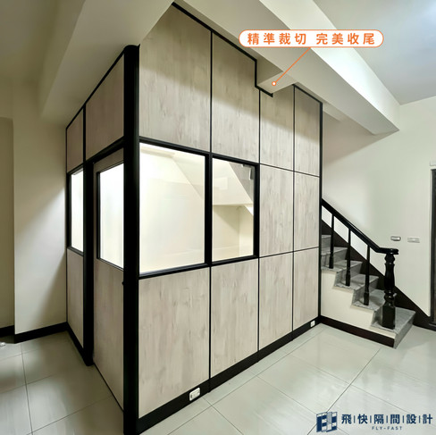 客戶要在居家一樓隔出個人工作室,卻因為挑高天花板有樑柱需注意的問題而困擾,看到飛快施工團隊專業的收尾 乾淨又漂亮,剛交屋就馬上與我們詢問隔間設計。